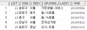 SELECT ROWNUM list, SGG, SIDO, UPJONG_CLASS1, YMD FROM CUSTOMER