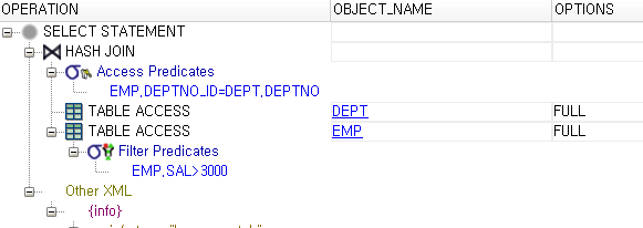 • 해시 조인은 먼저 선행 테이블을 결정하고 선행 테이블에서 주어진 조건(WHERE구)에 해당하는 행을 선택함