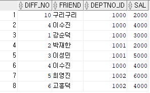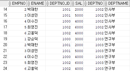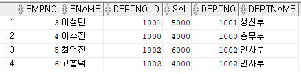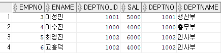 UNION ALL을 수행했을 때 EMP_2를 기준으로 했으므로 EMP_2의 칼럼명으로 출력됐으며, '이수진'이 중복해서 출력됐다.