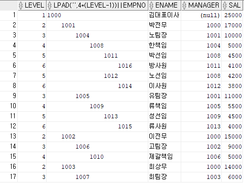 SELECT LEVEL, LPAD(' ', 4 * (LEVEL - 1) ) || EMPNO, ENAME, MANAGER, SAL FROM EMP