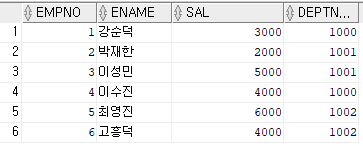 INSERT INTO EMP VALUES (6, '고흥덕', 1002, 4000);