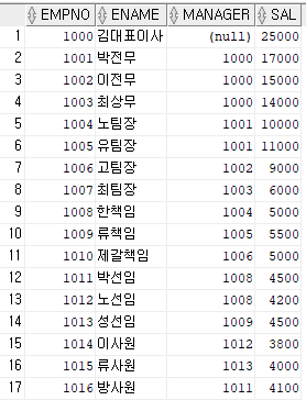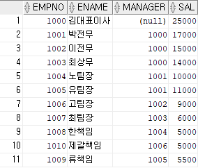 START WITH는 시작조건, CONNECT BY PRIOR은 조인 조건이다. MANAGER가 NULL인 김대표이사가 ROOT노드이며 ROOT노드부터 시작해 정방향으로 노드를 탐색한다.