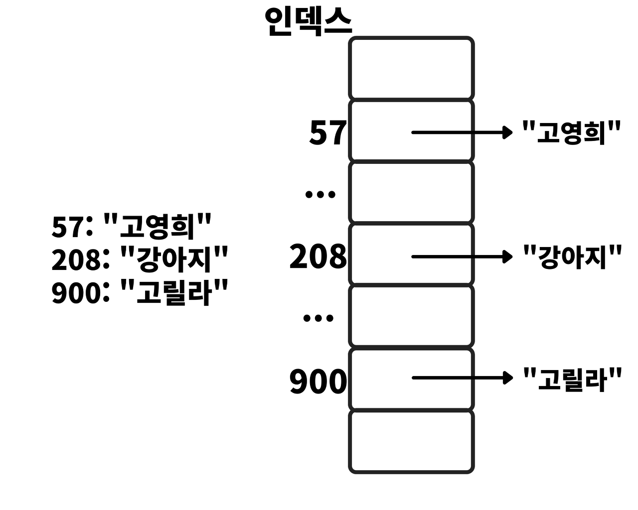 현재 key의 max값인 고릴라의 key가 900이기 때문에 큰 문제가 없지만, 만약 10^100을 키로 가진 데이터가 나타나면 10^100 + 1 크기 만큼의 배열을 생성해야 하므로 문제가 발생한다. 즉 낭비되는 공간이 너무 클 가능성이 있다.