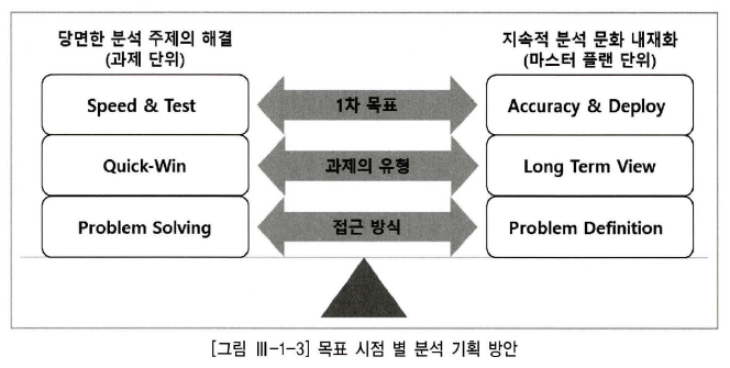 • 목표시점 별로 당면한 과제를 빠르게 해결하는 과제 중심적인 접근 방식과 지속적인 분석 내재화를 위한 장기적인 마스터 플랜 방식으로 나눌 수 있음