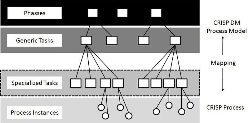 • 최상위 레벨은 여러 개의 단계(Phases)로 구성되고 각 단계는 일반화 테스크(Generic Tasks)를 포함함. 일반화 테스크데이터마이닝의 단일 프로세스를 완전하게 수행하는 단위이며, 이는 다시 구체적인 수행 레벨인 세분화 테스크(Specialized Tasks)로 구성됨