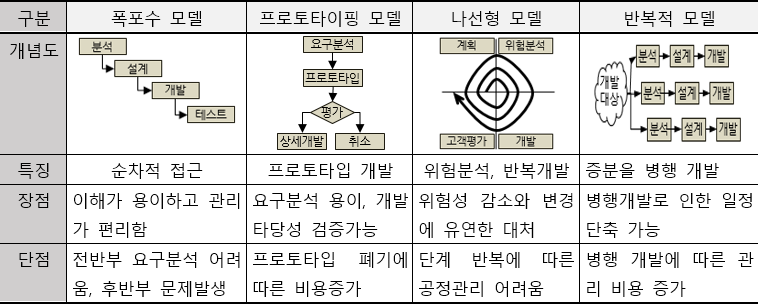 • 폭포수 모델의 단점을 보안하기 위해 점진적으로 시스템을 개발해 나가는 방법으로, 고객의 요구 사항을 완전하게 이해하고 있지 못하거나 완벽한 요구 분석의 어려움을 해결하기 위해 일부분을 우선 개발해 프로토타입으로 사용자에게 제공함. 이후 사용자의 요구를 분석하거나 요구 정당성을 점검, 성능을 평가해 그 결과를 통한 개선 작업을 시행하는 모델